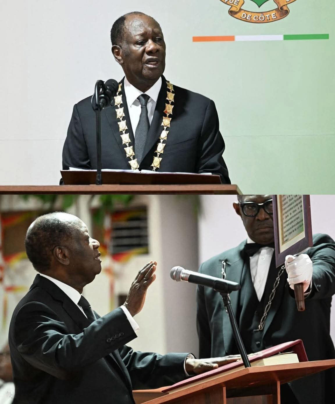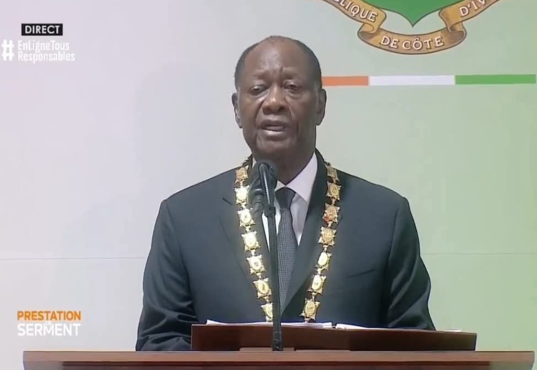 La main droite levée et la gauche sur la Constitution ivoirienne, il a prononcé la formule solennelle : «Devant le peuple souverain de Côte d’Ivoire, je jure solennellement et sur l’honneur de respecter et de défendre fidèlement la Constitution, d’incarner l’unité nationale, d’assurer la continuité de l’État et de défendre son intégrité territoriale, de protéger les droits et libertés des citoyens, de remplir consciencieusement les devoirs de ma charge dans l’intérêt supérieur de la nation».
